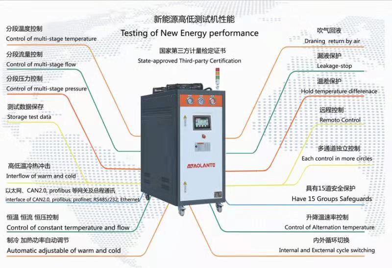 深圳奧蘭特機械新能源高低溫測試功能齊全,并且計量精度都是經(jīng)過國家第三方計量檢測機構檢驗,并取得檢定證書。在設備的流量控制、壓力控制、溫度控制精度都媲美進口設備。奧蘭特高低溫測試機功能多樣化,,具體有分段流量控制、分段溫度控制、分段壓力控制、制冷加熱功率自動調(diào)節(jié)、自動補液、吹氣回液、漏油報警、升降溫速率控制、單系統(tǒng)多通道獨立控制,擁有強大的通訊功能:485通訊、以太網(wǎng)、MODBUS、PRPFIBUS、CAN2.0,讓設備可以便捷的和主輔設備進行通訊遠程控制。深圳奧蘭特機械于國內(nèi)外眾多的新能源汽車廠家、檢測機構、汽車研究所都已經(jīng)進行深度合作。